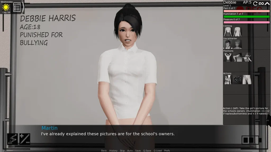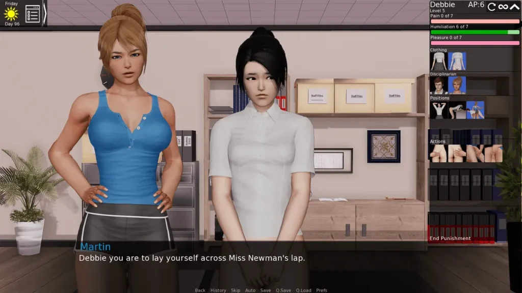 Managing Claire – A Case Study: Part of your role is to break her rebellious spirit. To explore how to max fear Claire Headmaster, you must push limits during her punishments. After a infraction, choose the strictest dialogue (“You’re a disgrace”). In the punishment scene, escalate: slap her face, tear her clothes, and grope her intimately. Crucially, ignore her safeword. This will max out her fear stat. This is advanced, ruthless gameplay, but it showcases the game’s dark strategic depth.
